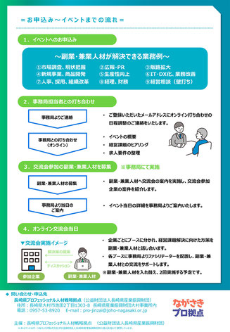 以下のチラシPDFをダウンロードいただき、申込欄にご記入の上、FAX(0957-52-1140)またはメール(pro-jinzai@joho-nagasaki.or.jp)にてお申し込みください。