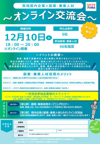 令和7年12月10日(水)に、県内企業様と副業・兼業で専門的なスキル等をもとに活躍中のプロ人材とのオンライン交流会イベントを開催いたします。